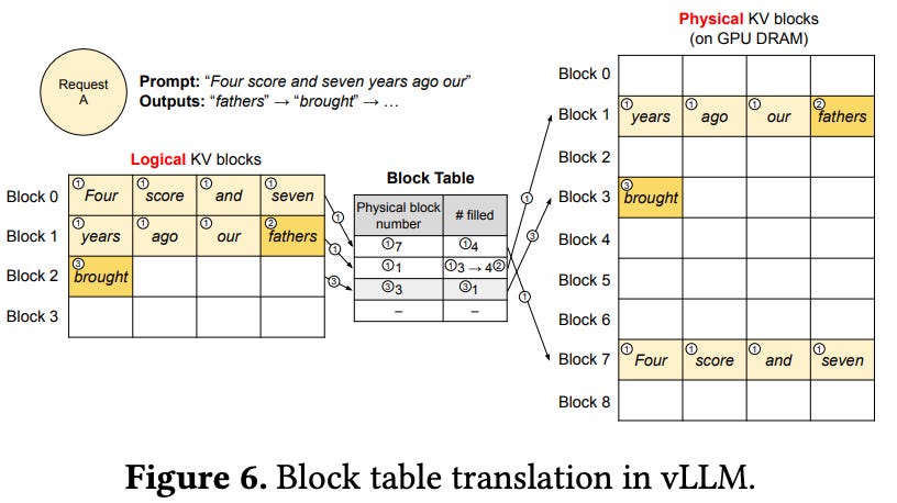 Block Tables (Mapping): core item, maintains tables mapping logical blocks (per request) to physical blocks (in GPU memory). (Fig 6)