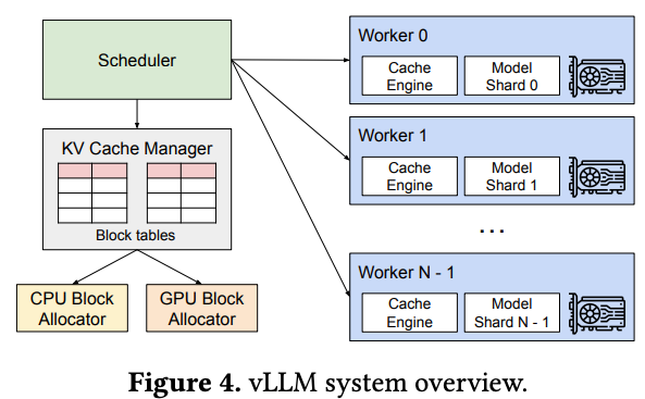 KV cache manager manages KV cache in pages for PagedAttention (manages physical KV cache mem on GPU workers through instructions sent by centralized scheduler).